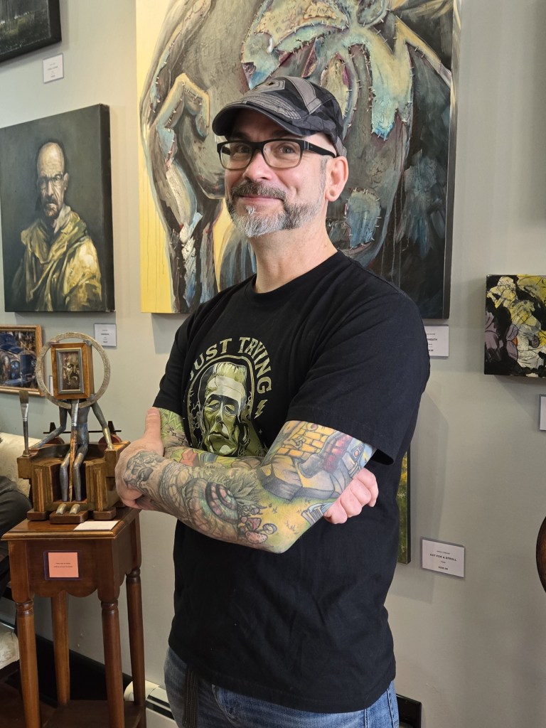 Martin was raised in Elliot Lake and has been creating art in one way or another all his life. After landing in St. Thomas several years ago, he added tattooing to his creative repertoire. It complemented his art practice and gave him a steady gig. He says, “Tattooing funds the art gallery.”