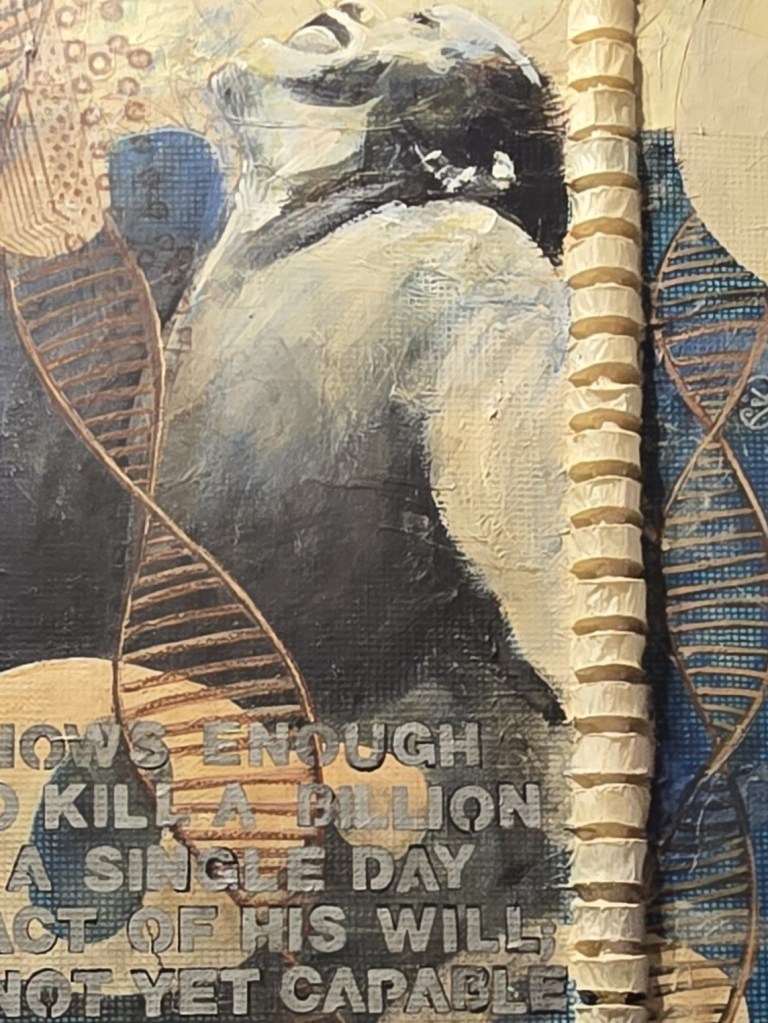 (Pictured: Marijo Swick, “Knowledge, Faith, Asimov” (detail), acrylic, rice paper. Photo by Beth Stewart.)